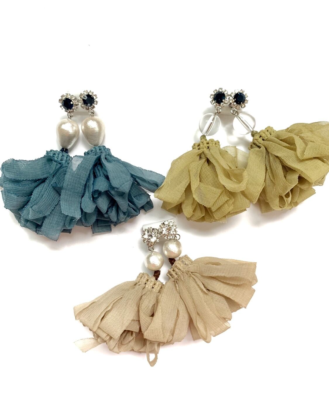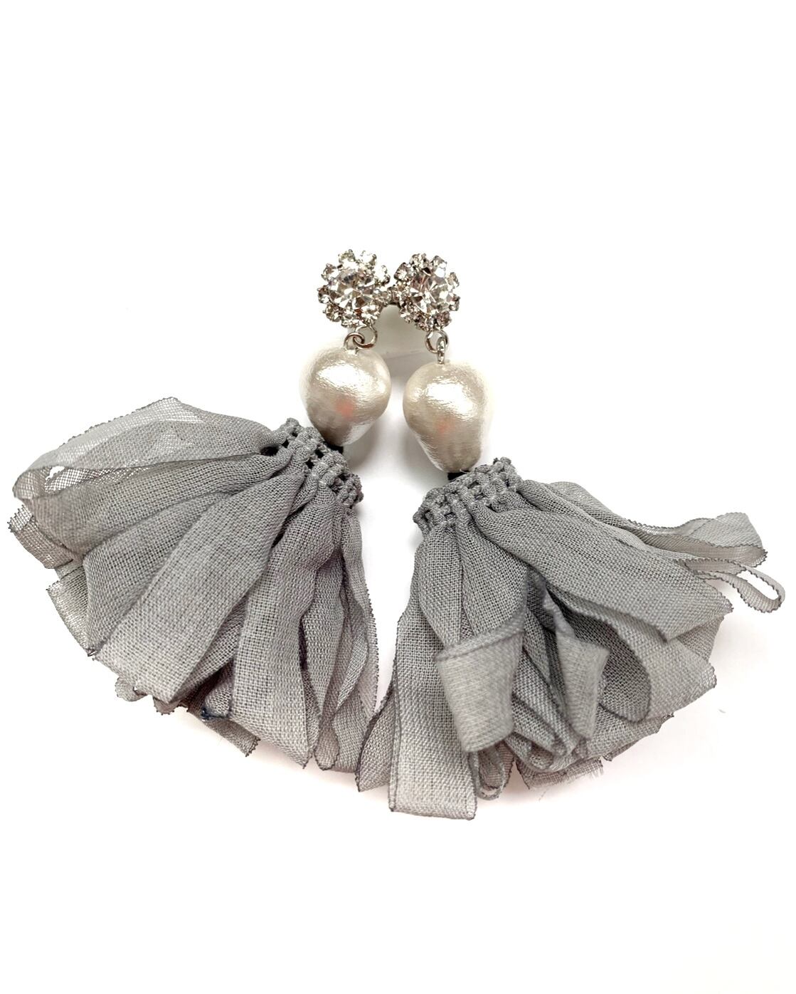 大振りデザインが耳元にアクセントを添えるプチフラワーシフォンフリンジピアス。