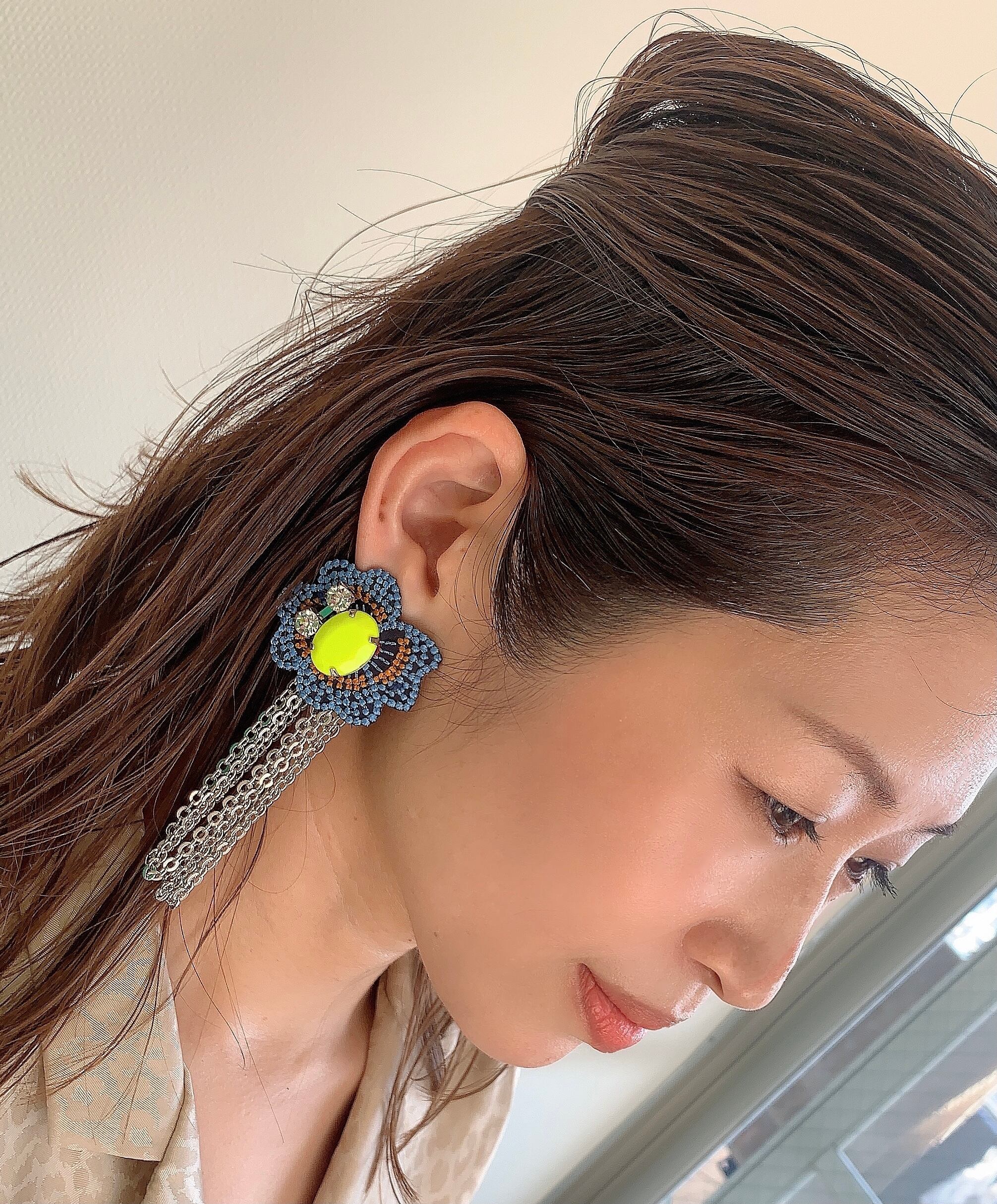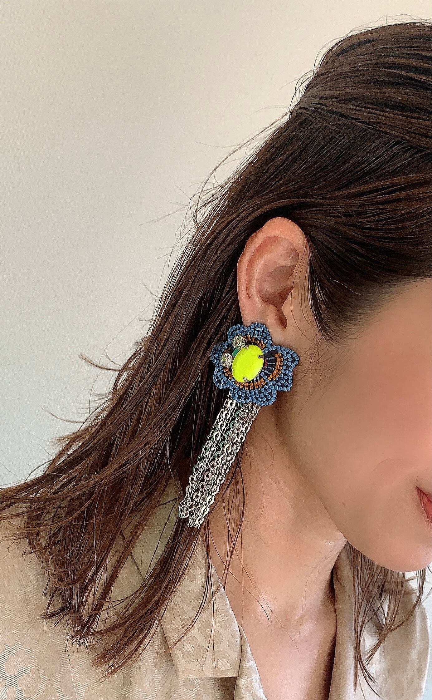 大ぶりのフラワーワッペンのトップからフリンジが揺れて、凛とした女性らしさを演出します。
