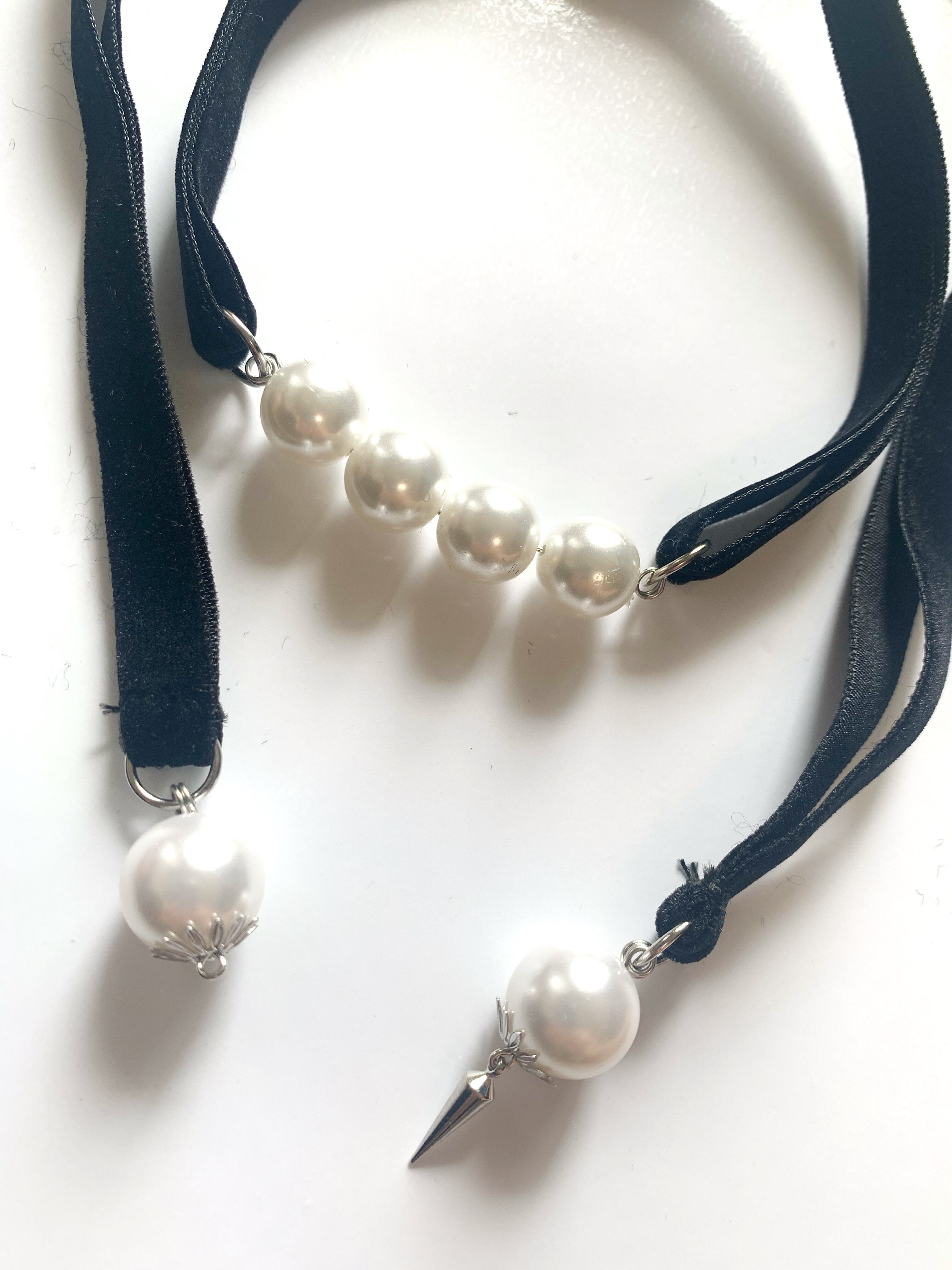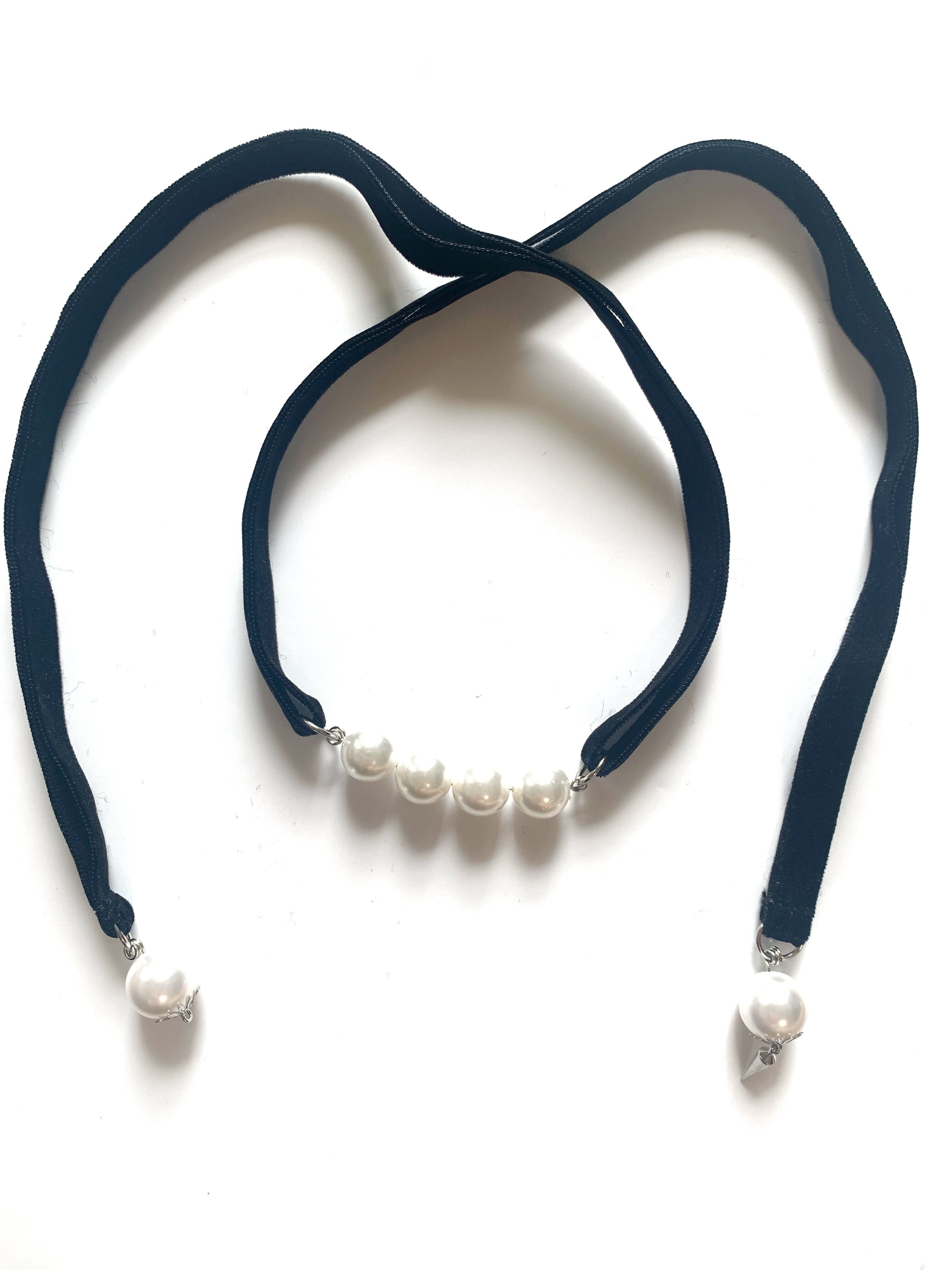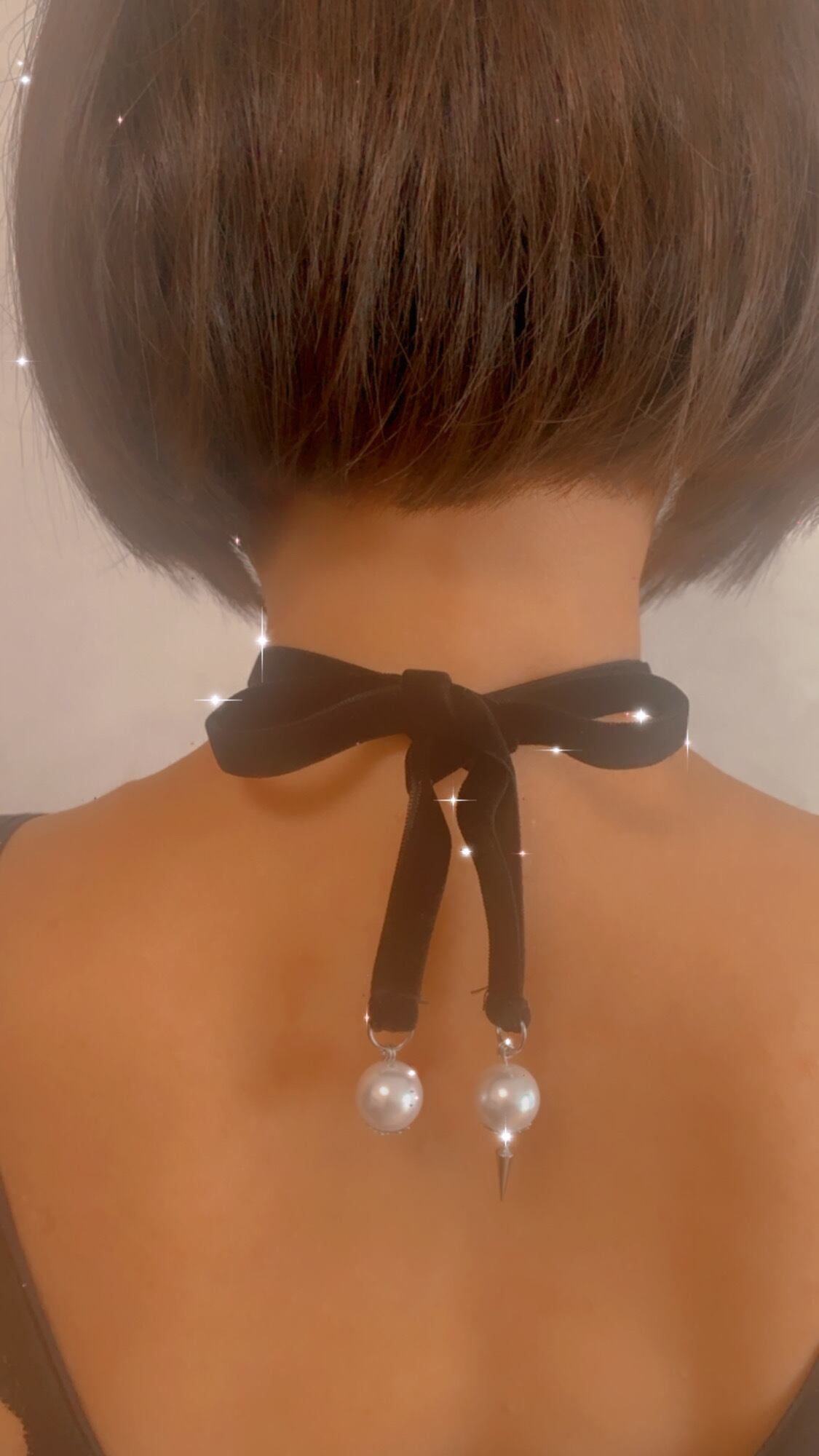 パールとベルベット素材のリボンとの合わせが上品な雰囲気に◎バックスタイルはリボンに結ぶと両サイドころんとしたパールがチェリーのように可愛らしく華やかに演出します♡