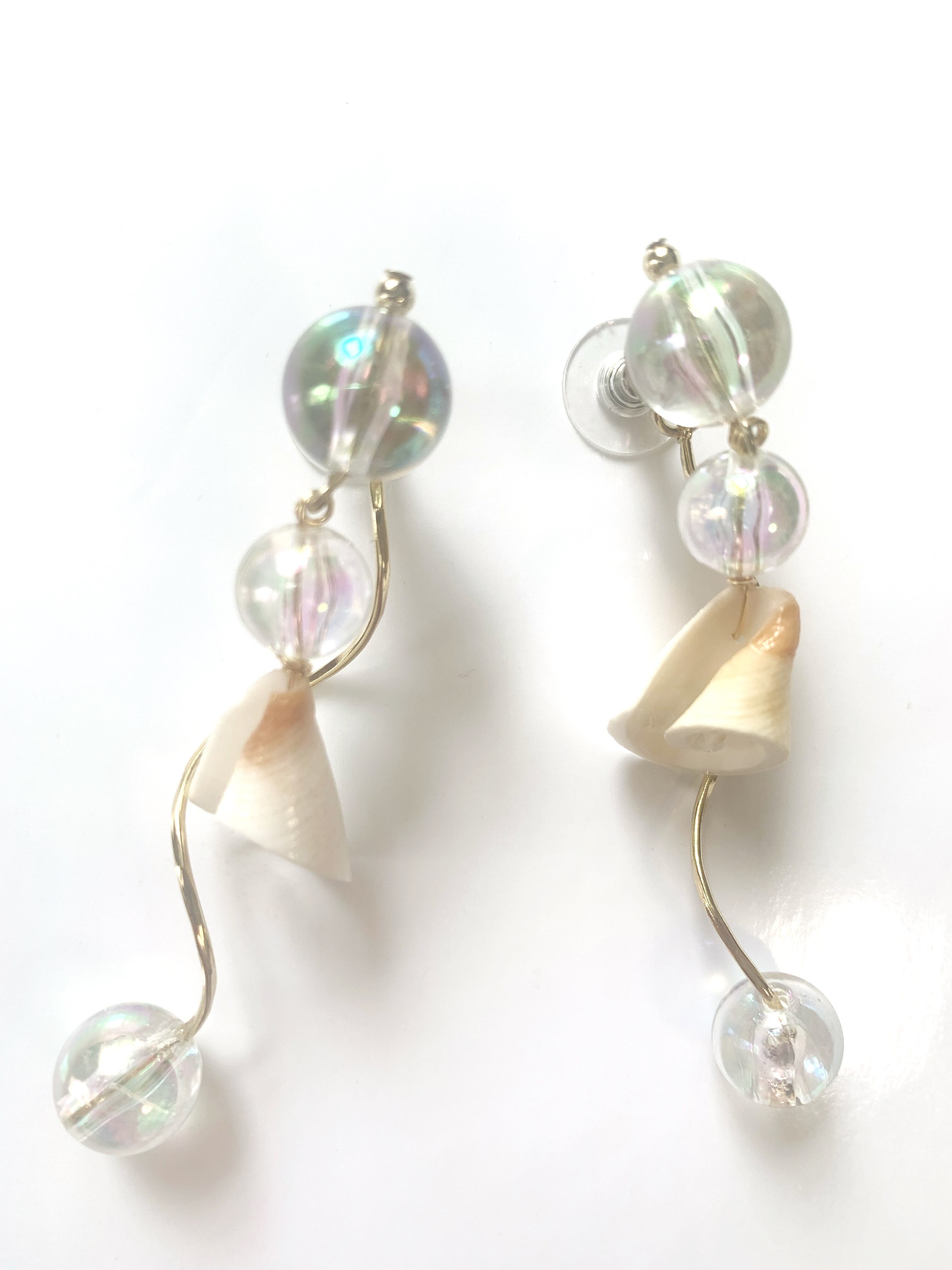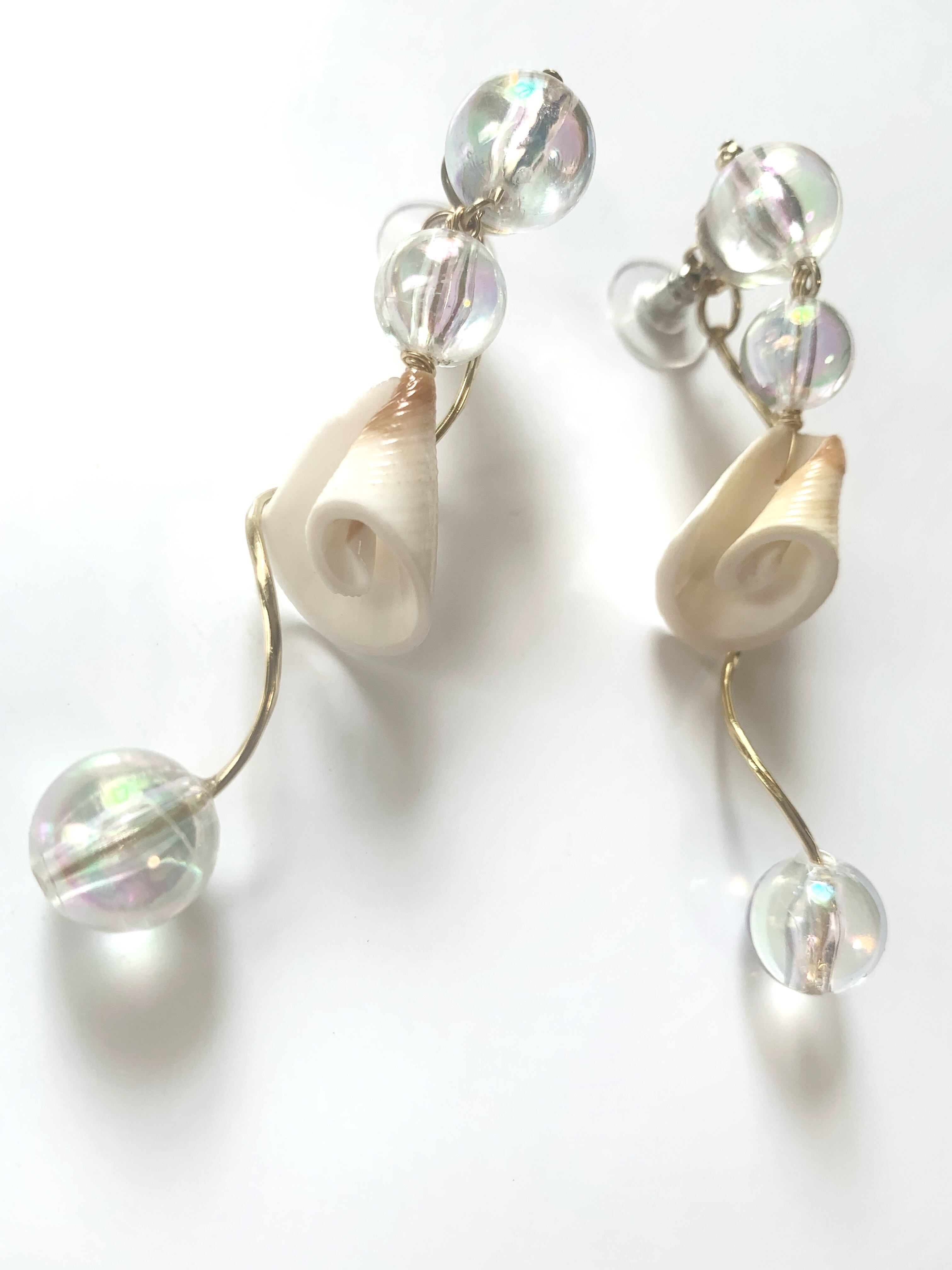天然のスクロールシェル(巻貝)をモチーフにした海を感じられるピアス。虹色のようなクリアビーズはシャボン玉のようなイメージで天然シェルとの組み合わせがとても可愛らしく仕上がってます。