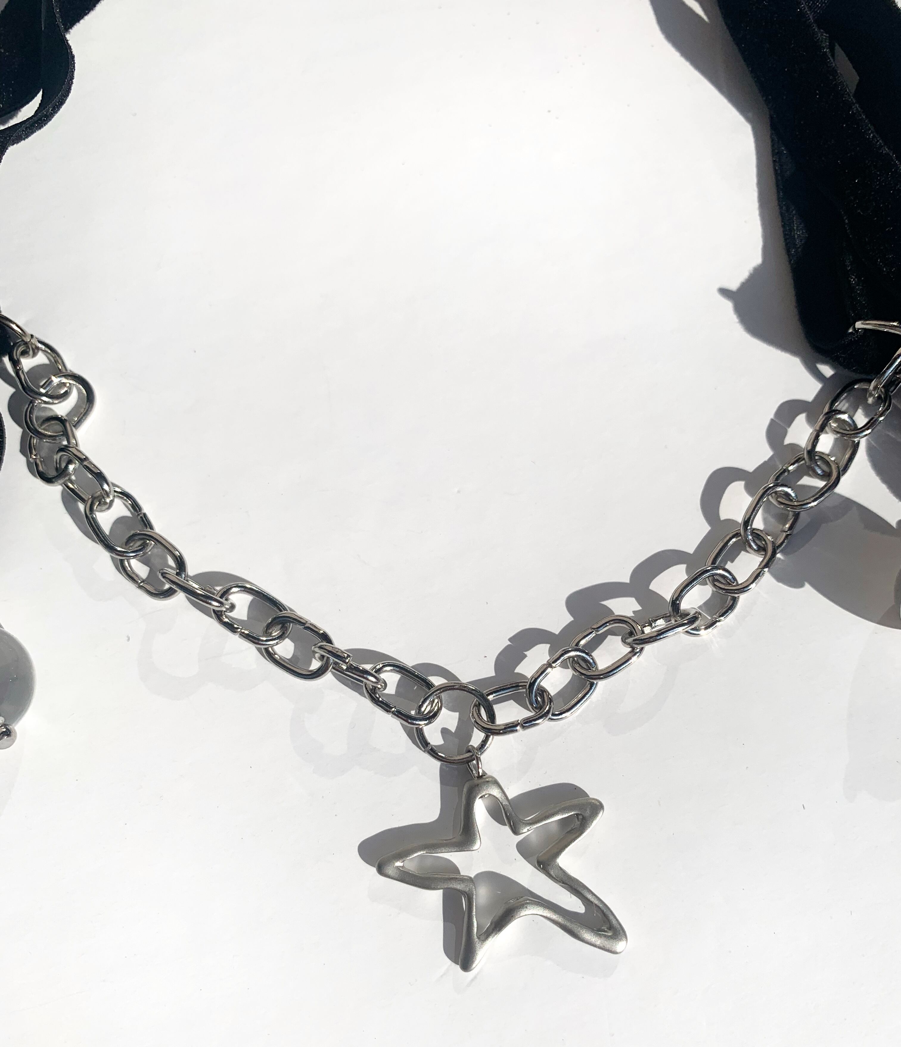 スターフープとチェーンのクラシカルなパンキッシュアクセサリーのリボンチョーカーの登場です。